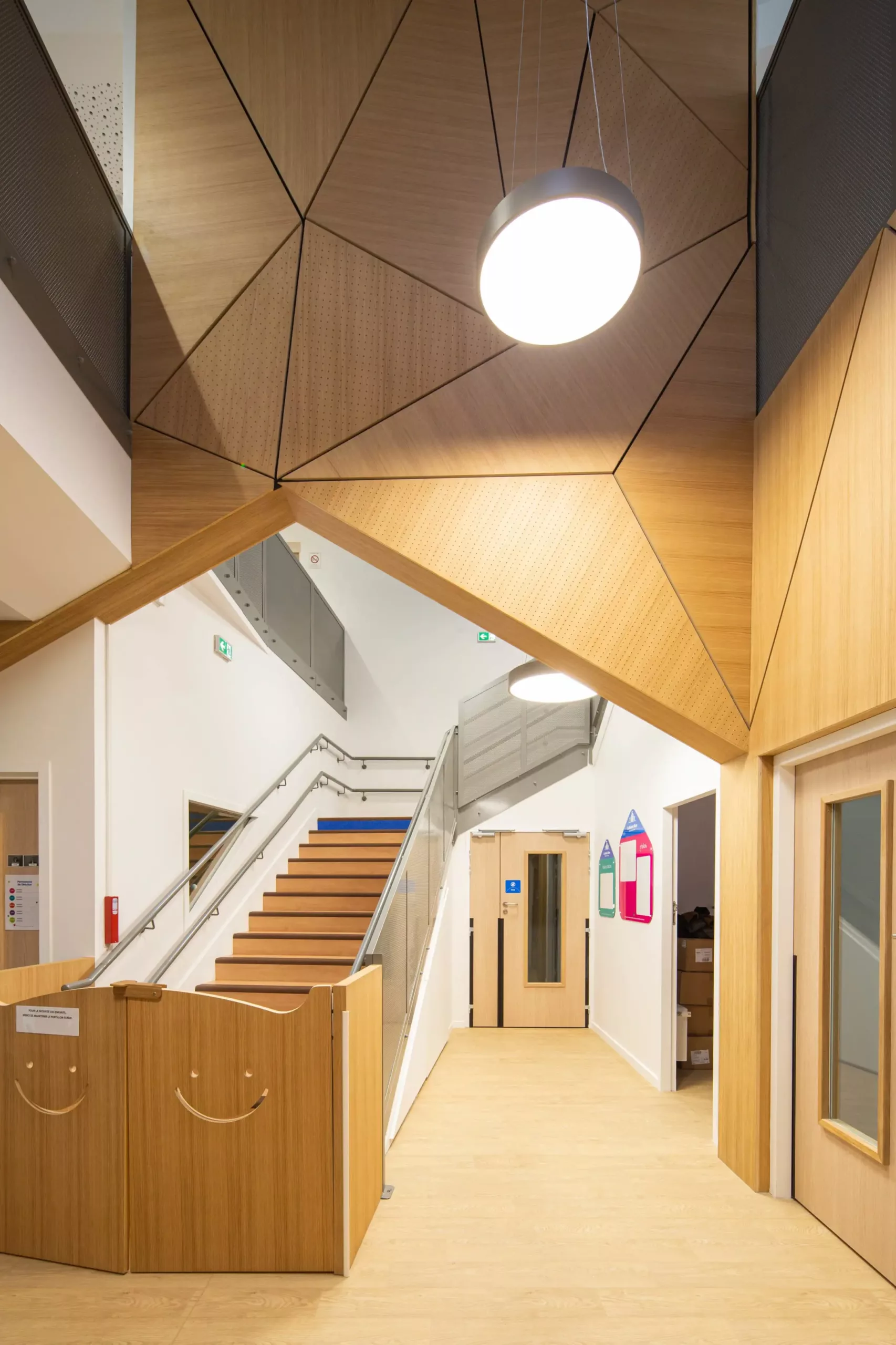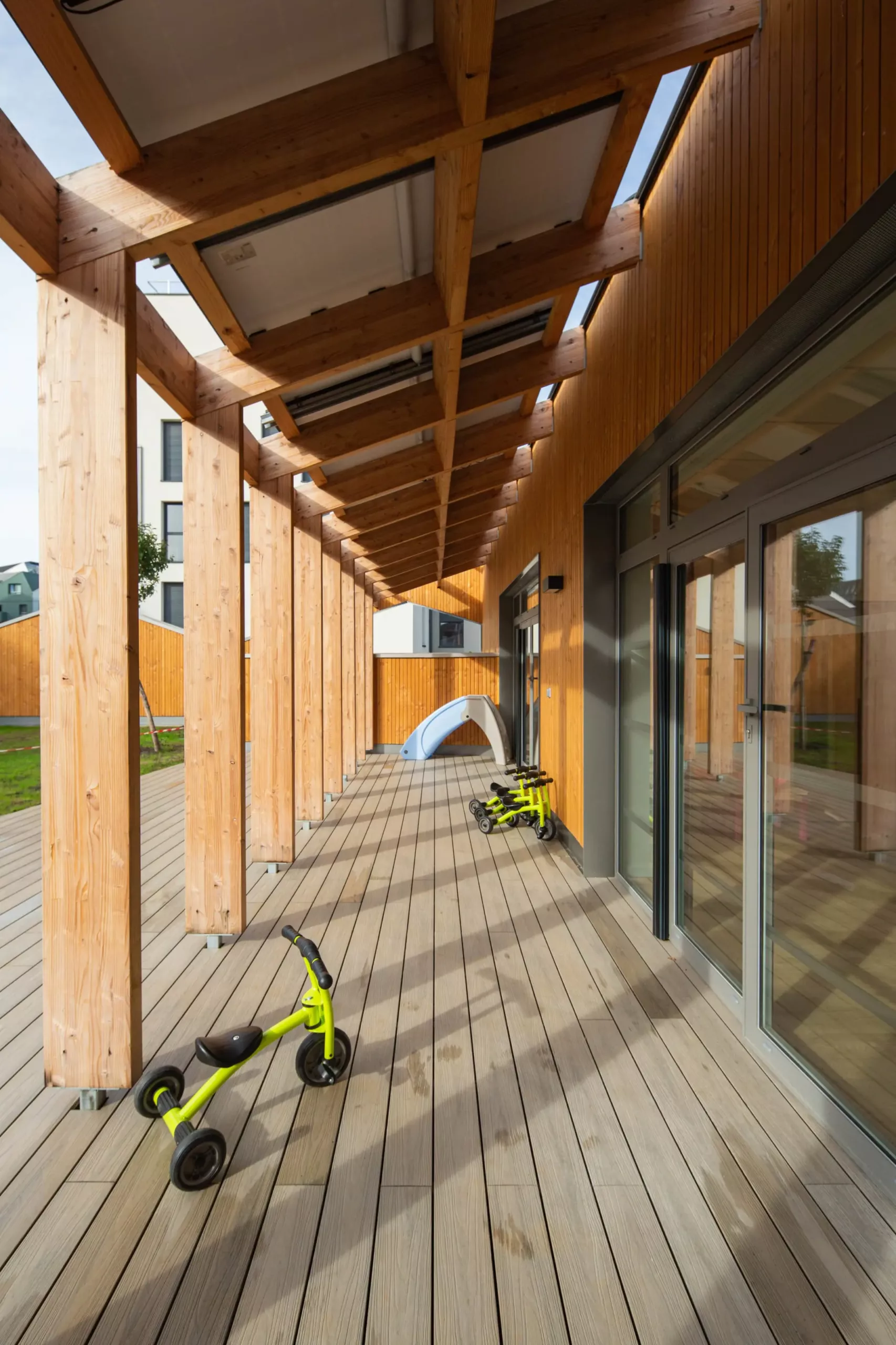 Le projet se distingue par ses caractéristiques écologiques et durables : une toiture végétalisée, un chauffage urbain utilisant la biomasse et une installation de panneaux photovoltaïques pour fournir environ 50 % de l'énergie consommée par la crèche. La structure du bâtiment a été entièrement réalisée en béton, garantissant une construction solide, durable et résistante aux intempéries. Ce choix de matériau a également offert une bonne isolation acoustique et thermique, assurant le confort des enfants et du personnel.