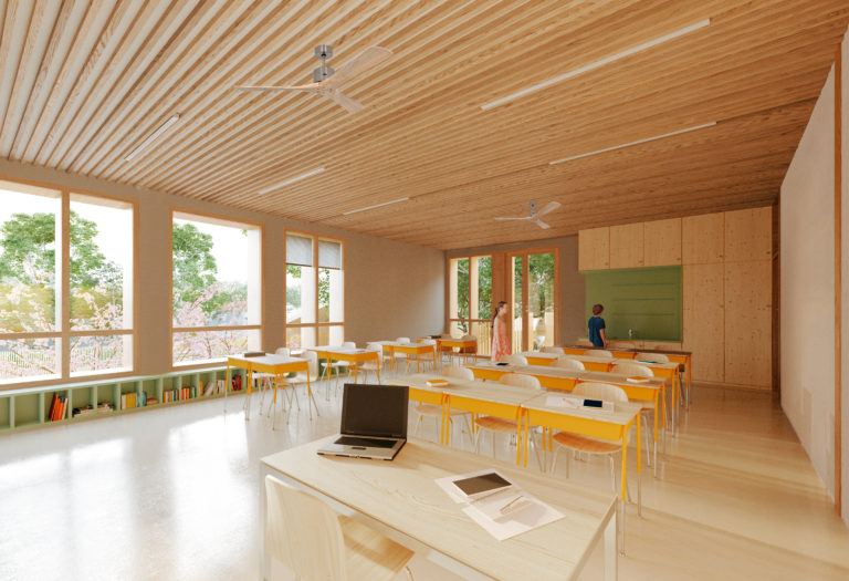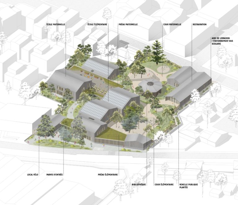 La nouvelle école primaire Jacques Prévert à Bègles a été conçue pour répondre à la croissance démographique tout en respectant des exigences environnementales et pédagogiques modernes. Implantée sur le site de l’ancienne école, elle en conserve certains éléments emblématiques, comme la charpente et les gradins, transformés en bibliothèque centrale. Organisée comme un village de pavillons à taille d’enfant, l’école privilégie les matériaux biosourcés, la ventilation naturelle, la lumière maîtrisée et une production énergétique durable (géothermie et photovoltaïque). Les espaces extérieurs sont largement végétalisés, favorisant l’apprentissage en plein air. L’ensemble constitue un lieu évolutif, ouvert sur le quartier, à la fois fonctionnel, apaisant et en harmonie avec son environnement.