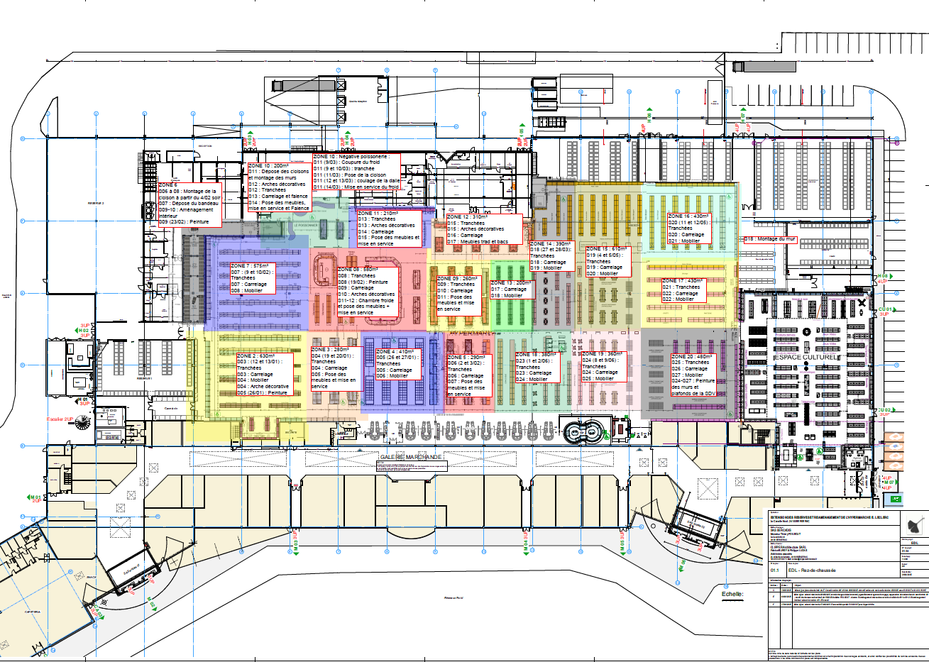 Le chantier du magasin est organisé en 20 phases successives afin d’assurer la continuité d’activité tout en garantissant la sécurité des usagers et des équipes. Ces phases couvrent l’ensemble des travaux liés à l’extension du bâtiment, à la rénovation des zones existantes et au remodelling des espaces de vente. Chaque étape est planifiée de manière progressive pour limiter les nuisances et optimiser les délais d’exécution. Cette organisation phasée permet une coordination efficace des corps de métier et une adaptation permanente aux contraintes d’un site en exploitation.